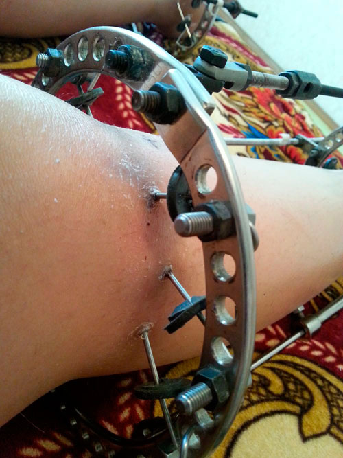 После этого опять чистым ватным диском обработать место вокруг спиц перекисью водорода 3% и наложить повязку при помощи стерильного бинта.