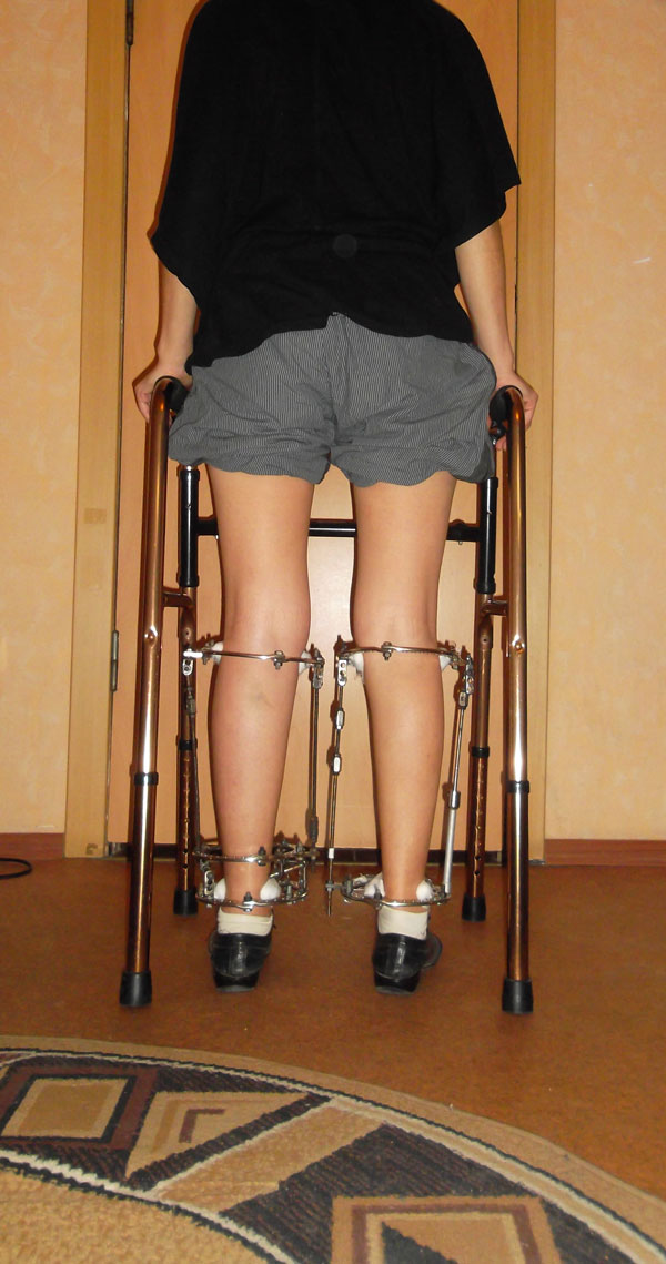 Вышла на фиксацию. Деформация ног и ротация слева устранены.