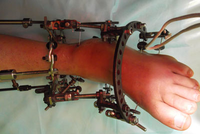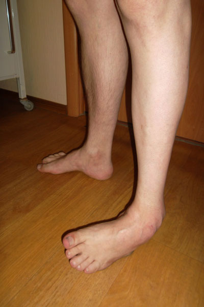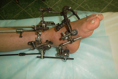 В 1992 году перенёс энцефалит, после этого левая стопа с годами начала деформироваться всё сильнее и сильнее. Последнее время стопа при нагрузки стала вывихиваться, появились ужасные боли, ходить становится всё труднее. Мне 42 года, в клинике Онипко мне поставили диагноз "Состояние после перенесенного энцефалита, эквино-поло-варусная деформация стопы, прогрессирующий подвывих голеностопного сустава в порочном положении, деформирующий артроз". 20 июля Н.Н. сделал операцию- артродез голеностопного сустава(остеосинтез компресирующим аппаратом Илизарова-Онипко. Швы сняли на 10-ый день, через 2 недели выписали домой.Фото до операцииФото до операцииФото до операции