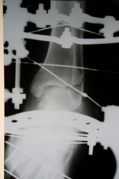 Рентген через 1,5 месяца после операцииХожу на костылях, перевязки за 150 км приезжаю делать в клинику один раз в 10 дней. Там же мне и делают компрессию по всем стержням. :)