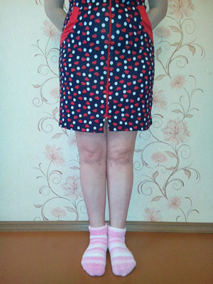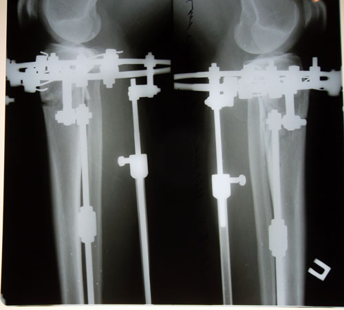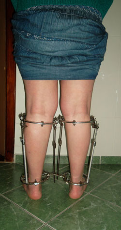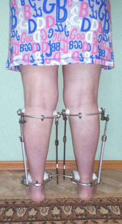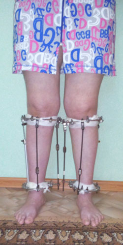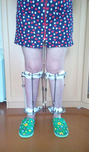 Здравствуйте Николай Николаевич и Наталья!!! Высылаю фото ног через 2 недели после выписки с клиники. Самочувствие получше стало! Эти спицы также 2 раза в день обрабатываю, есть немного воспаление. При ходьбе и когда долго сидишь, правая нога немного отекает и синеет, но уже не так как раньше. Хожу на костылях. Мимо зеркала просто так пройти не могу....)))) обязательно остановлюсь...полюбуюсь ножками и дальше пошла. Уже привыкла к аппаратам и к своим новым ножкам.... Только фото до ОП напоминает о прошлом... Даже не верится, что когда-то они были другими.