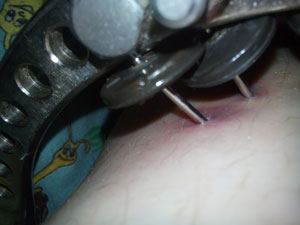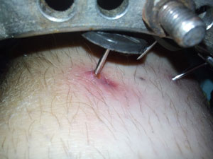 Ещё одна спица на этой же правой ноге только сверху воспаленная и такое же отделяемое как и на нижней спице и также очень болит