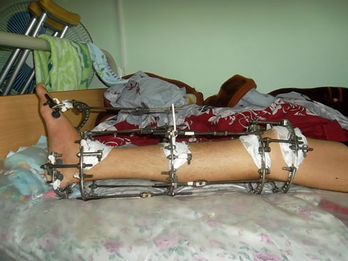 Привет моим гостям! Извиняюсь за долгое отсутствие. Ладно о том как мои дела.. Состояние очень даже хорошее, еще бы щас у меня уже период фиксации идет и крутки закончились. Т.е. 0,00005 км достигнуты! Страшные боли прекратились с концом круток. Числа 10 июля Док снял половину аппаратов, которые предназначались для фиксации колена, стопы и пятки, семь спиц, кольцо и два полукольца были удалены. Но с ним стала новая задача - отрабатывать мышцы. После фиксации колено не сгибалось, носок уходил вниз. Но время лечит все что покалечило! каждый день по чуток сгибал, отрабатывал стопу, прошло меньше месяца и теперь колена уже сгибается на прямой угол. Поначалу конечно страшно приходят всякие мысли, а что если не отработается, а что если так навсегда останется, особенно боялся за стопу. Но оно и понятно кость на 5 см удлинился и мягкие ткани на столько же должны удлиниться. Недавно лопнулась спица, по закону Мёрфи это случилось в выходные. Пришлось вызывать Константина Николаевича, который заделал мне ту же спицу выпрямив запас. Затем начала воспалятся одна спица, с которым боролись несколько дней с разными растворами, в конце концов пришлось ее удалить. Да и правильно сделали эта спица резала мыщцы, было больно и она тянула меня назад, не давала нормально двигаться. А так как я хочу скоро выписаться из больницы попросил Н.Н. провести мне новые спицы. В операционной под местной анестезией провели две спицы (взамен удаленной и лопнувшей). Процедура не из приятных, но болезненным тоже не назовешь. Вот эти спицы тоже пару дней порезались щас уже меньше. Мышцы на бедрах засохшие, можно сказать кость и кожа. Вот и их качаю потихоньку. Думаю неделька другую встану наконец на свою ногу. Пока передвигаюсь только на костылях. Давит на меня все это 3 месяца невозможности передвигаться на своих ногах, вероятность воспаления спиц так как мне еще месяца 3-4 в аппаратах ходить. Кстати у меня обнаружилась язва желудка, может она у меня и была но меня она до этого не беспокоила. Всему виной антибиотики которые кололи после каждой операции и обезбол. уколы и таблетки которые я принимал круглосуточно в самые тяжелые дни. Самый тяжелый период это когда уже 3см удлинили и начинается. Боли страшные. никому не пожелаешь. Если я в те дни писал свой дневник наверное он был наполнен нытьём ))) Да были моменты когда я жалел что пошел на это. Но приводил мозг в себя. Конечно в нашем случае оптимизма побольше надо, но невсегда удается подбадривать себя. вспомнился анекдот: " Пессимист видит только темноту, оптимист видит свет в конце тоннеля, реалист видит свет в конце тоннеля и слышит грохот железных колес. И только машинист видит трех идиотов на своем пути! " )))