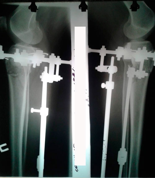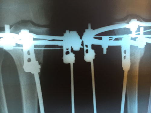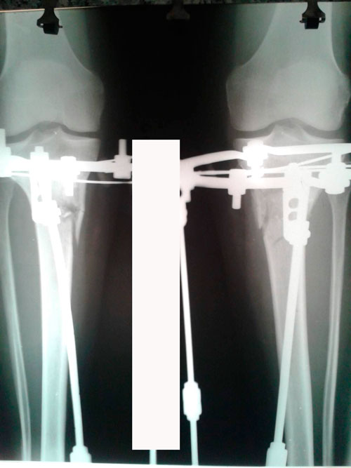 Здравствуйте, А.! Костная мозоль не плохая, но учитывая слабое состояние костной ткани (слабые кости) во время операции, ещё месяц ходим в аппаратах. Через месяц можете приезжать на снятие аппаратов, рентген сделаете на месте в клинике. С собой привозите костыли.