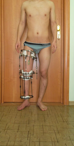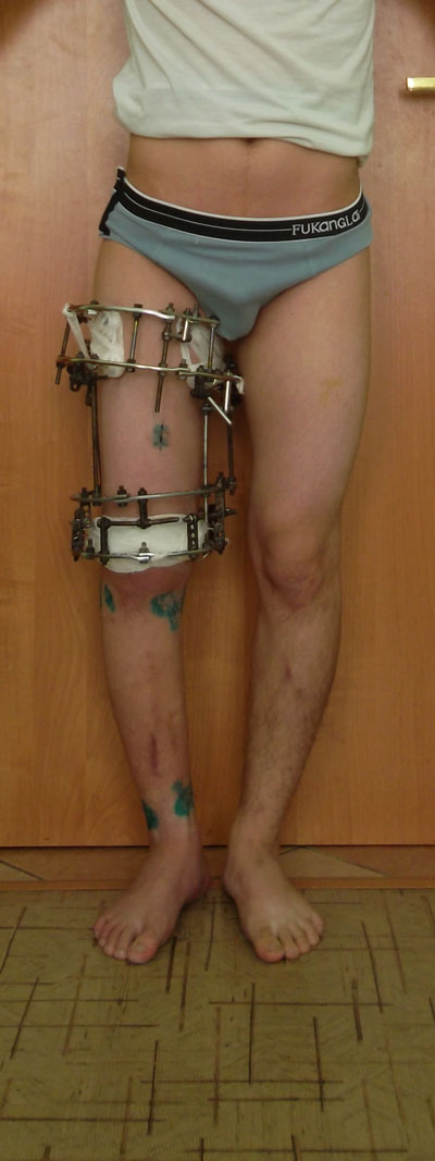 Операция прошла успешно, ну, как я знаю, здесь все операции проходят успешно. От наркоза отходить было трудно, был пьяным)). А когда отошел от наркоза то увидел на ноге аппарат Илизарова-Онипко. Как на фото. Первый день прошел трудно, были боли, а как иначе. Все терпимо)). На следующий день полегчело, колили антибиотики и обезболивающие. Что меня удивило я мог уже вставать. Через несколько дней начались крутки, это самое главное, тебе начинают выравнивать ногу, на твоих же глазах. В течении около двух недель мне выровнили ногу. Крутки закончились, все позади. Потом нижний аппарат сняли. Верхний снимут через 2 месяца.